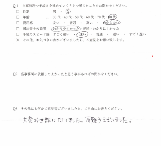 司法書士の先生の対応、費用等、本当に依頼してよかったと思います。